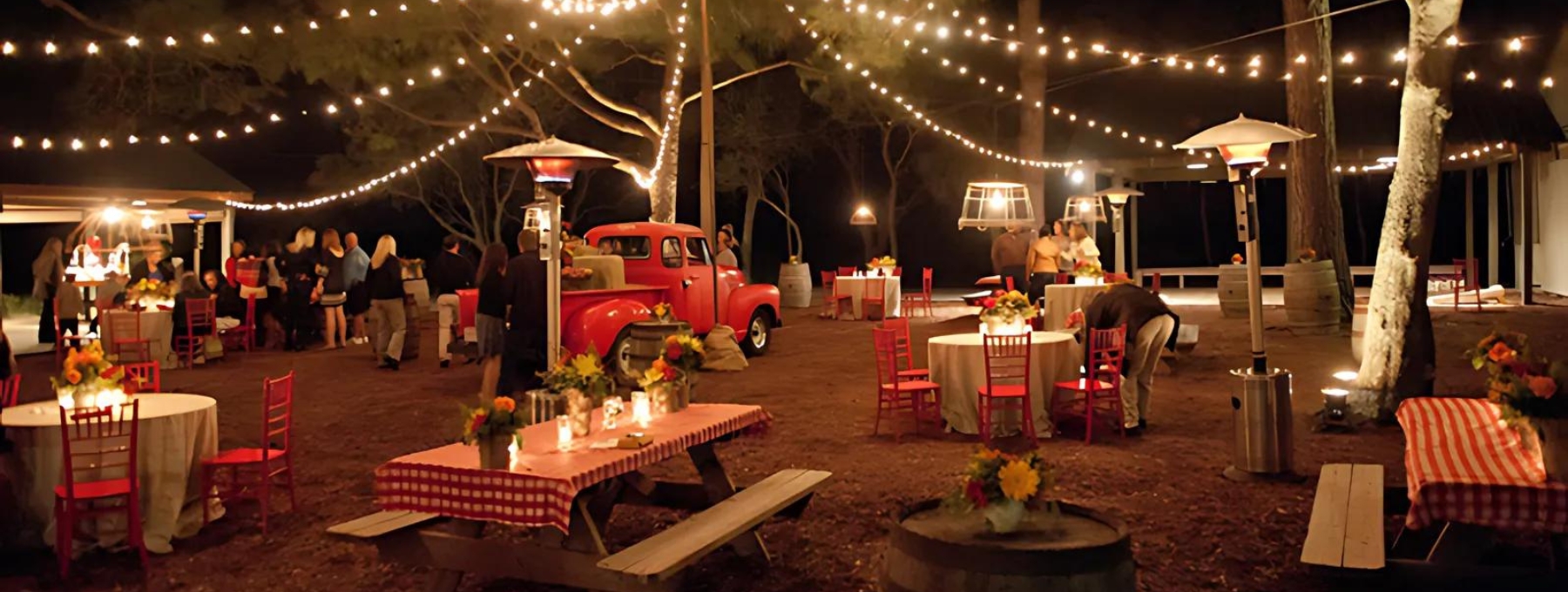 De pétillantes nappes Vichy donnent le ton, elles enjolivent à merveille les tables en bois. Des chaises et des bancs agrémentés de tonneaux mange debout parachèvent cette ambiance fête folklorique dîner dansant.